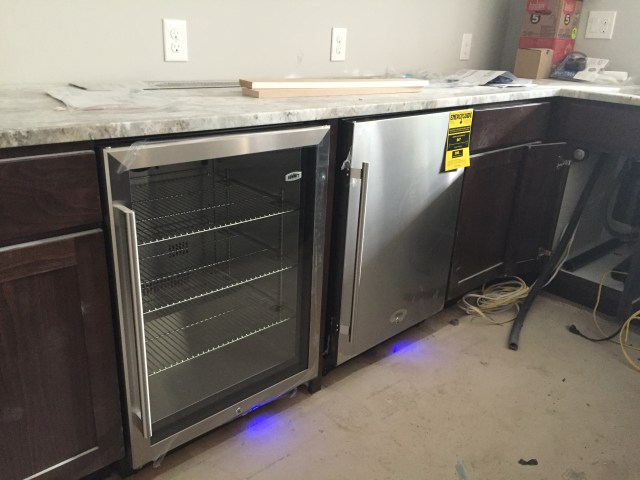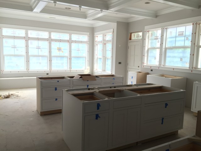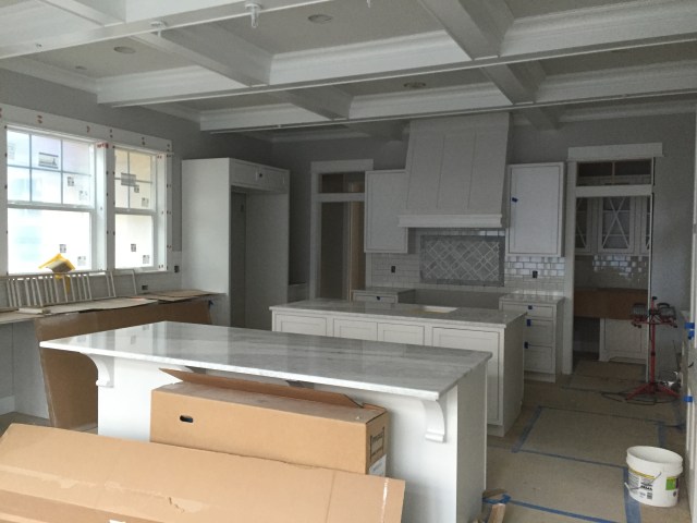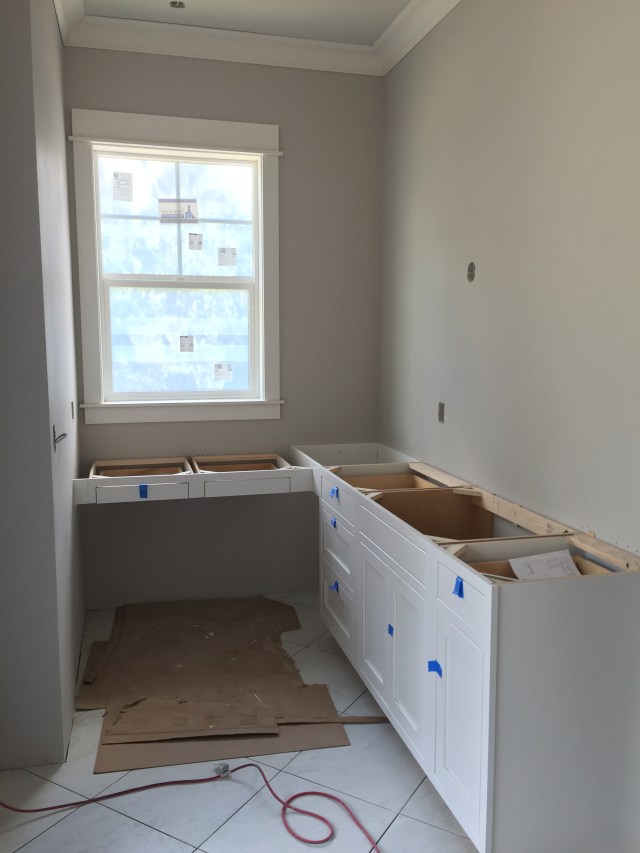 Besides all of the trimwork, they also added some more detail on the cabinetry. Matt pointed out that if we added crown all the way around the kitchen hood (like I wanted) that the crown would basically touch the other pieces of crown in the coiffured ceiling. So that’s out of the question…so that’s a bummer. But I still think it looks good as is without it – definitely my favorite feature in the kitchen, and it’s pretty fun that I got to design it! Feet were also added to a few cabinets throughout the house – which I also had custom designed based on some pictures of kitchens that I liked on Houzz.