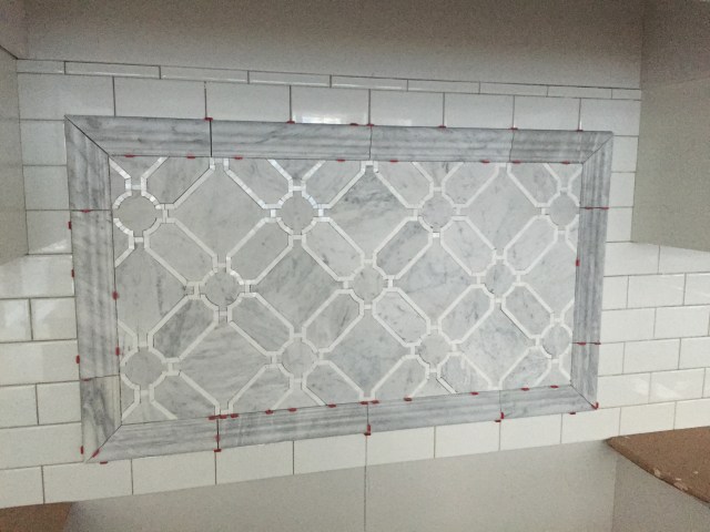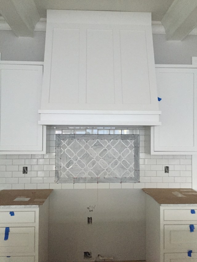 Tile work also continued this week. Although choosing and shopping for tile was my absolute least favorite thing to do for the entire build, I love seeing it all installed. Most of our selections were pretty basic, but even seeing white subway tile instead of drywall is fun. On top of that, the tile my mom and I chose for the backsplash behind the range arrived and I brought that out to the house. On Wednesday, I met the tiling sub onsite to go through the layout with him. Originally, we were going to have a different border that had a dark gray bardglio marble liner and then a white chair rail that matches the subway tile backsplash. Unfortunately though, the bardiglio came in and looked too blue to really coordinate with the beautiful mosaic tile. So we ended up using a carrara marble chair rail. We needed it this week though so there wasn’t any time to special order in the profile of the moulding that I wanted. Luckily, good ol’ Home Depot carries one that will work perfectly. Not so perfectly is that you have to find the marble in gray and white. And when you see them at the stores, about 80% of them look white with brown veining. Ick. I’m not kidding you – to find the 12 pieces that we needed to frame the backsplash, my mom and I went to 6 different Home Depot stores! Unreal. But now that we have them, I love them and totally worth the drive time to find them. Plus at $6 each, they were about 7 times cheaper than the ones that I wanted to order in! Score!!! I hope it gets installed back behind the range soon – I can’t wait to see it on the wall!
