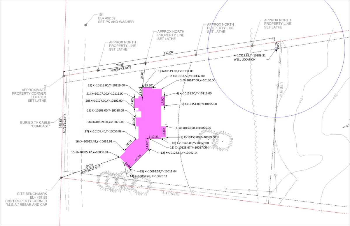 SitePlan_06092015_for Surveying Published June 13, 2015 at 2040 × 1320 in Week 1: Surveying « Previous Here is our site plan which ahead of time I located all of the coordinates for the house corner points (and the well location) to guide us throughout the day.