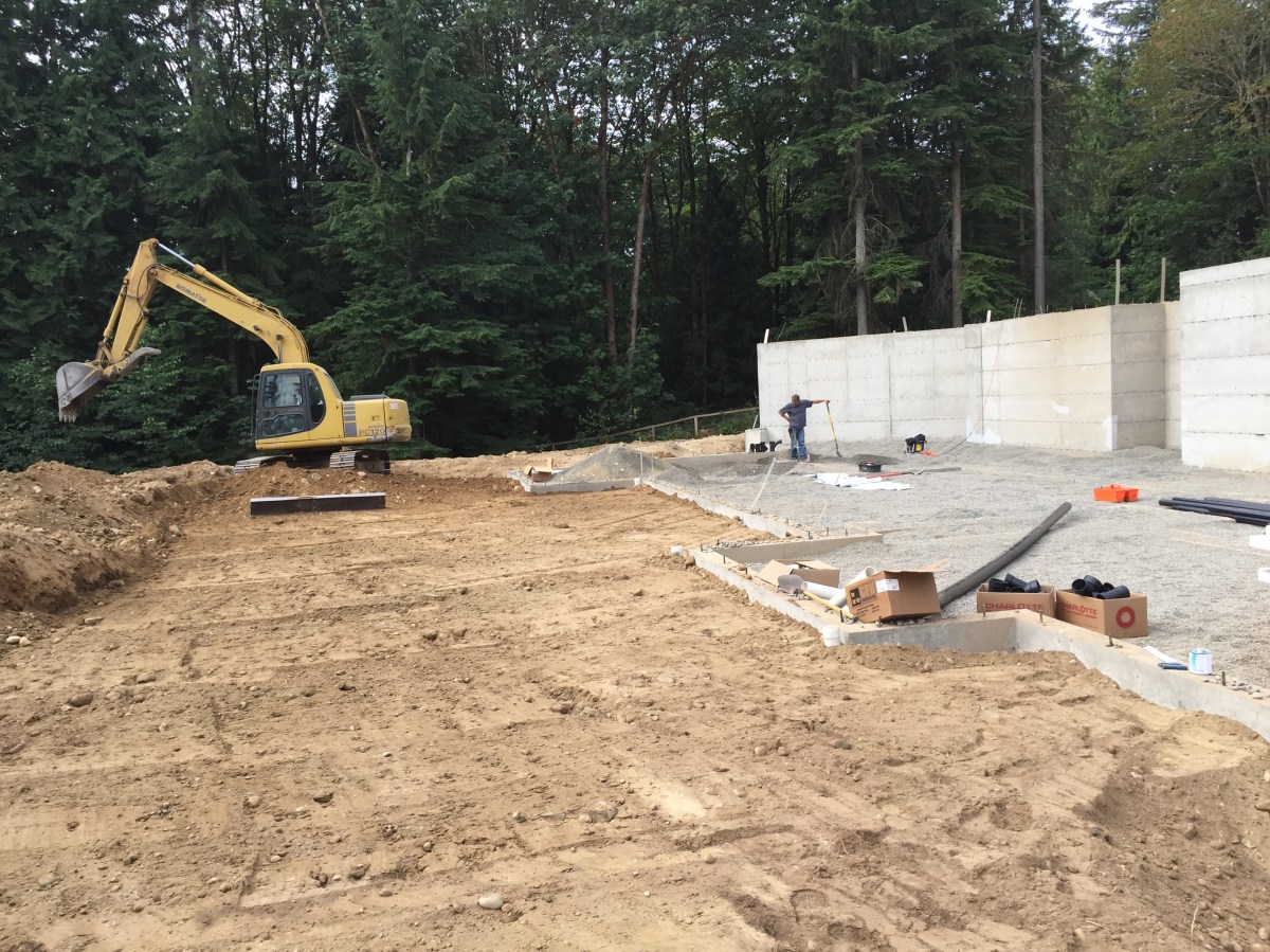 2015-07-23 09.04.45 Published July 25, 2015 at 3264 × 2448 in Week 7: Waterproofing, Plumbing, Well Pumping & Cabinetry Shopping « Previous Next » In action – regrading the back patio area…and the plumber looking annoyed about the digging!