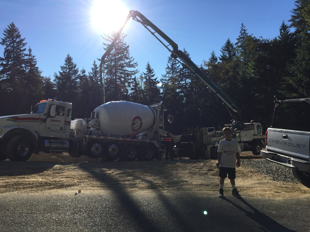2015-07-31 08.08.12 Published August 1, 2015 at 3264 × 2448 in Week 8: Basement Slab & Passed our Well Report « Previous Next » The concrete and pump trucks were situated up by the road with the arm of the pump truck reaching over the basement wall.