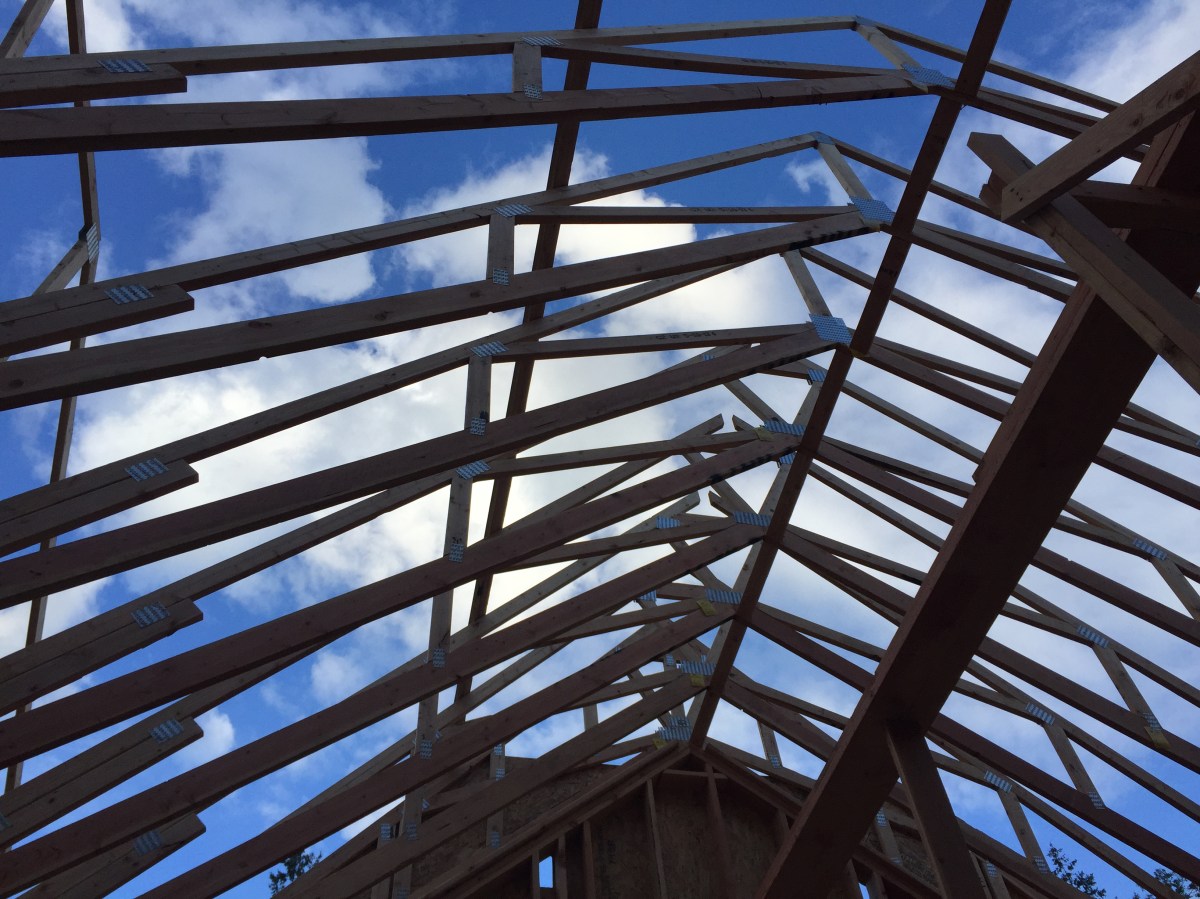 2015-09-02 18.12.18 Published September 5, 2015 at 3264 × 2448 in Week 13: Trusses are Up & Barge Board Design « Previous Next » Another view of the trusses from underneath. Love the blue skies!