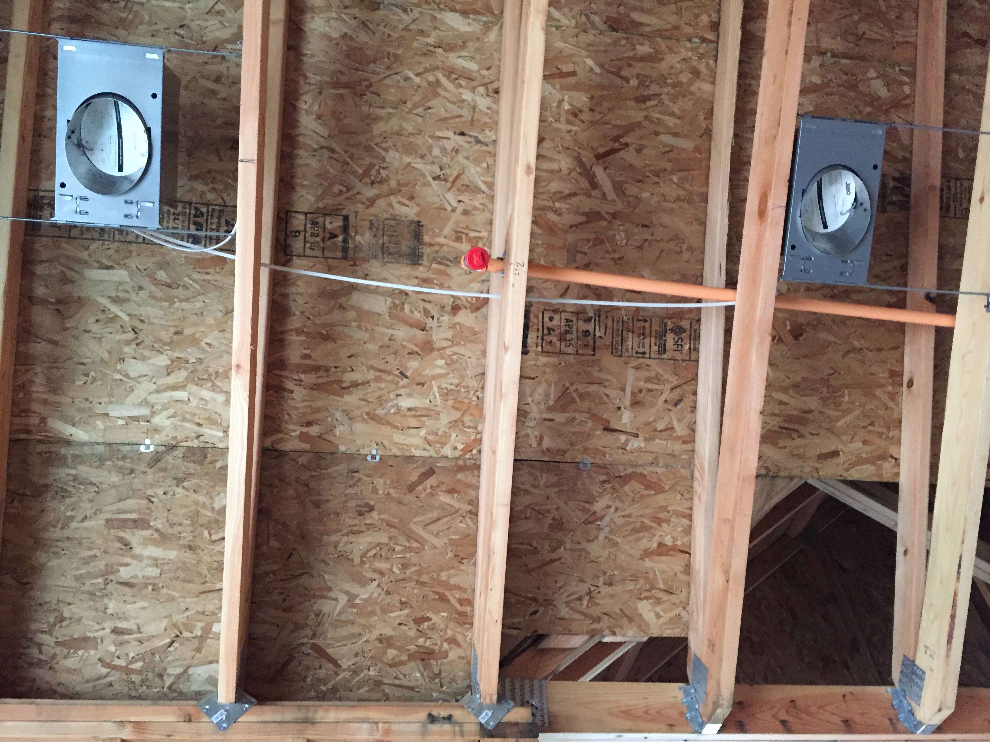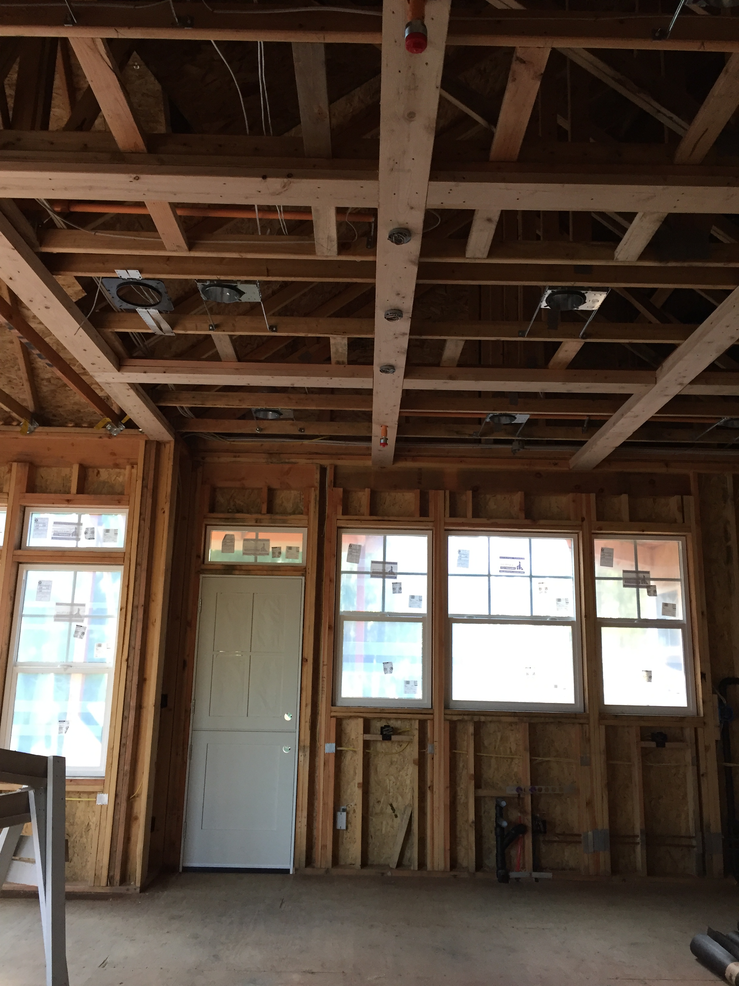 Although the weather has been nasty – they did install the fire sprinklers in the house. In private homes, King County requires fire sprinklers for all homes where a firefighter can’t walk 150′ around the house and touch all sides. Had I realized this was a requirement, I likely would have shaped the house differently just to avoid the fire sprinklers. I think they’re such a waste of money and hopefully we’ll never have to use them. Plus, they just add more things in the ceiling…not exactly my favorite.