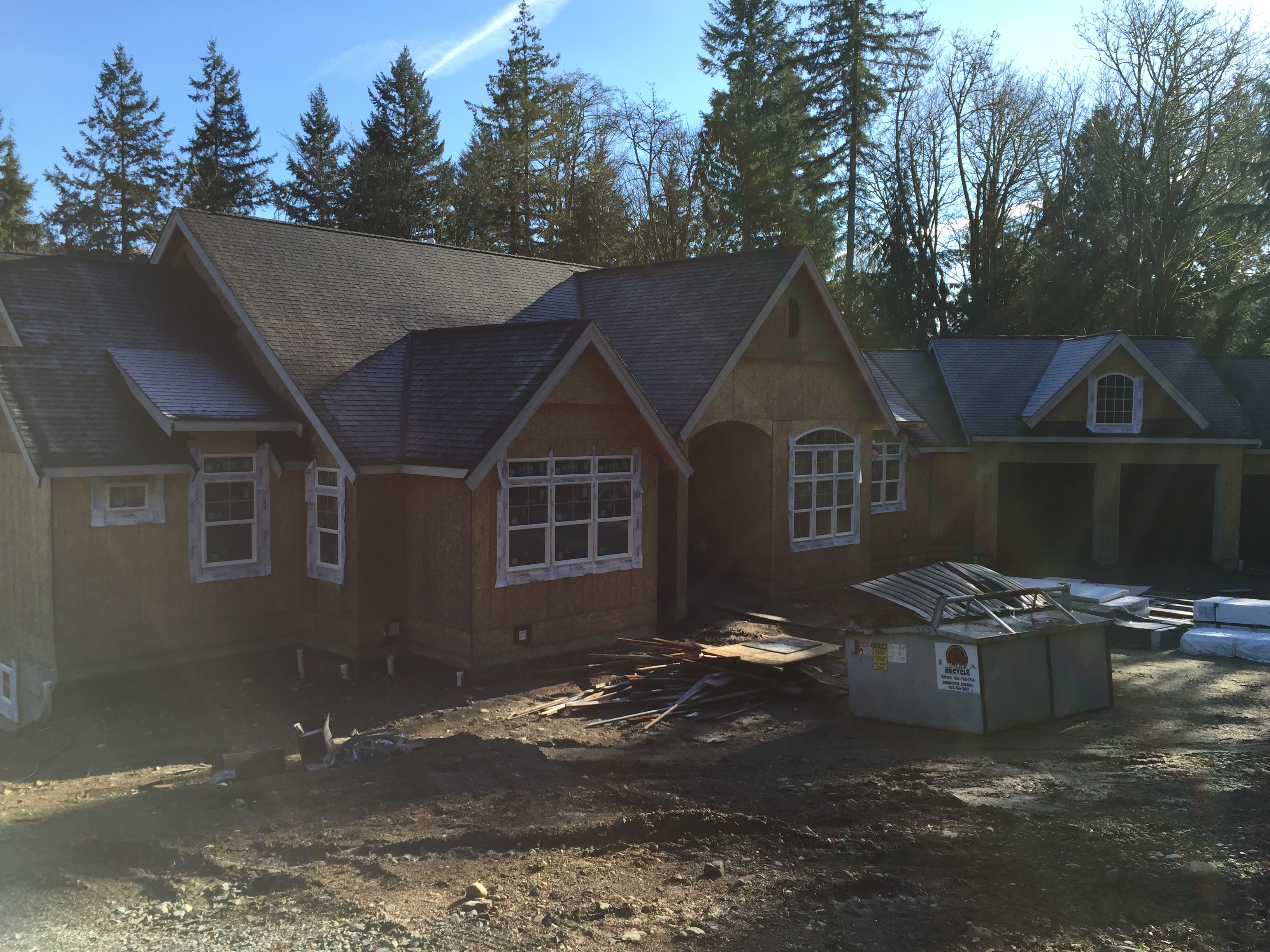 I was traveling for work the majority of last week and this week, and I heard that Seattle has been having a crazy week of weather! There’s been an insane amount of rain – flood warnings were in place with the torrential downpour. And on Tuesday there were crazy winds with gusts up to 60 miles per hour. People all over the Puget Sound (including our new neighborhood) lost power for days. Due to all of the inclement weather, a couple things were delayed on the project. First off, the siding company was supposed to be there this week, but they were unable to finish their last job, so that delayed them getting to ours. Also, the power company (Tanner Electric) was going to transfer the power line from the temporary power pole we have to the permanent underground service to the house. Needless to say with all of the outages in the area, they had more important thing to deal with than our house.