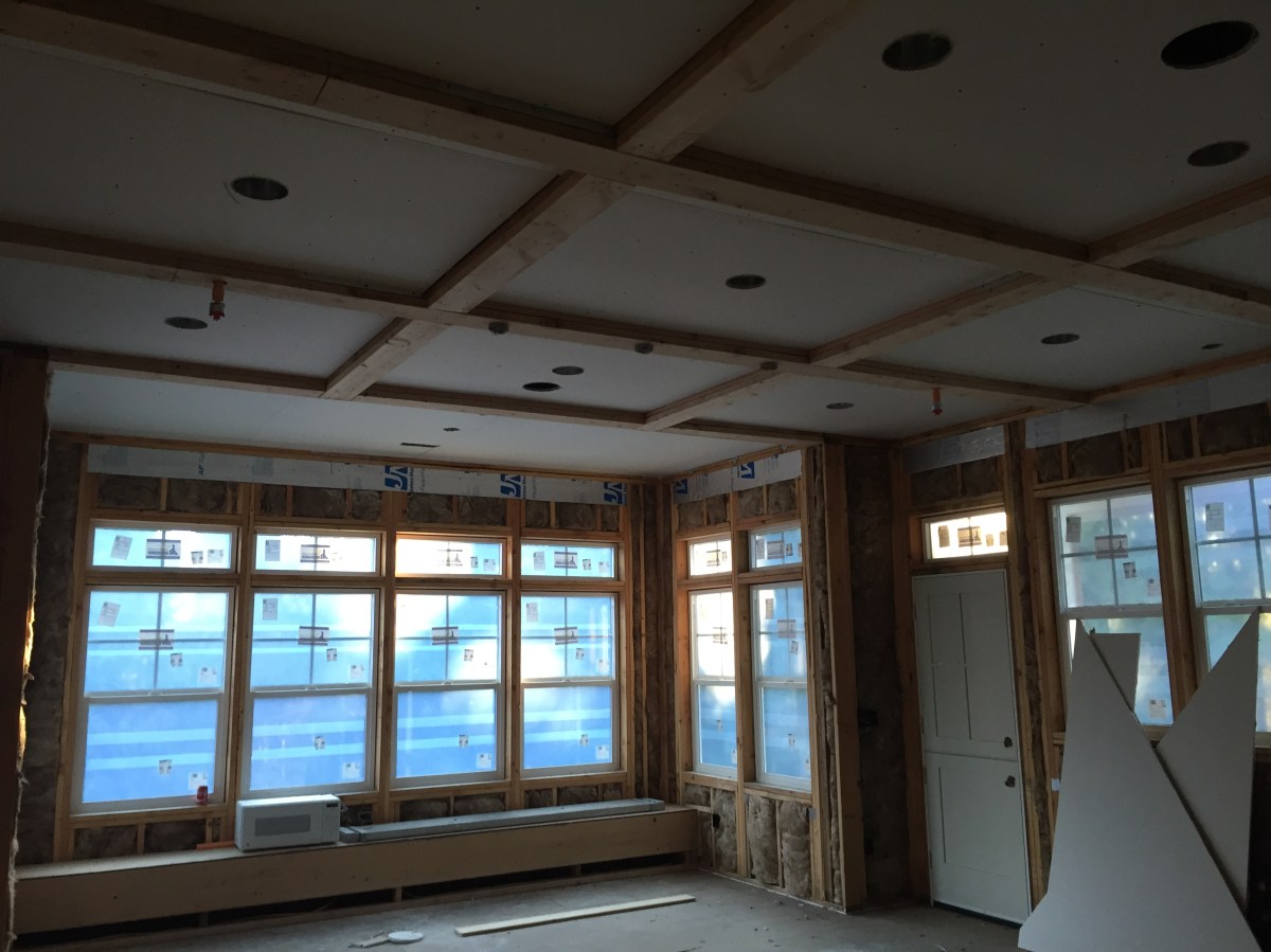 2016-01-09 09.19.55 Published January 10, 2016 at 3264 × 2448 in Week 31: Siding Complete, Insulation Complete, Gutters Complete, & Drywall Started « Previous Next » The drywall really makes the ceiling details stand out – here’s the future coffered ceilings in the kitchen.