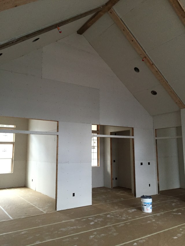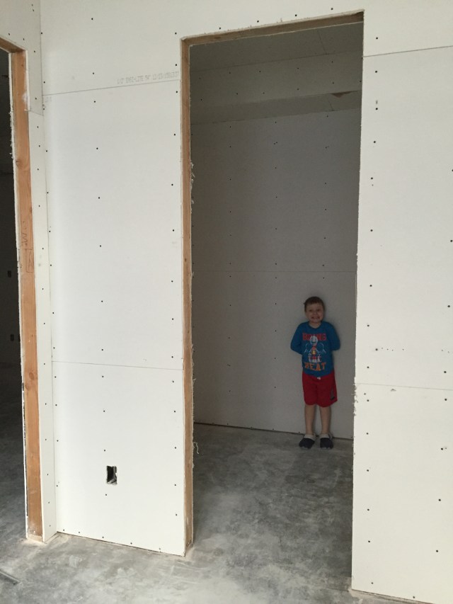 The drywall installation wrapped up this week and it was Absolutely Amazing to walk in and see all the walls with drywall. The floors were covered with paper getting ready for the taping & mudding next week so it looked crazy clean in there too! Spencer and I visited on Saturday and had so much fun checking out each room. We also ran some errands including heading to Home Depot for some tools to take off the plumbing fixtures on our bathtub and to Sherwin Williams to check out different paint sheens. Surprisingly, Sherwin Williams has a great little coloring table for kids to sit at – perfect for Spencer!