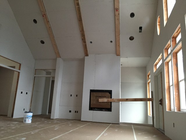 - Sort of a random viewpoint – it’s looking up between the great room on the right and the kitchen on the left. The faux beams run right into each other!