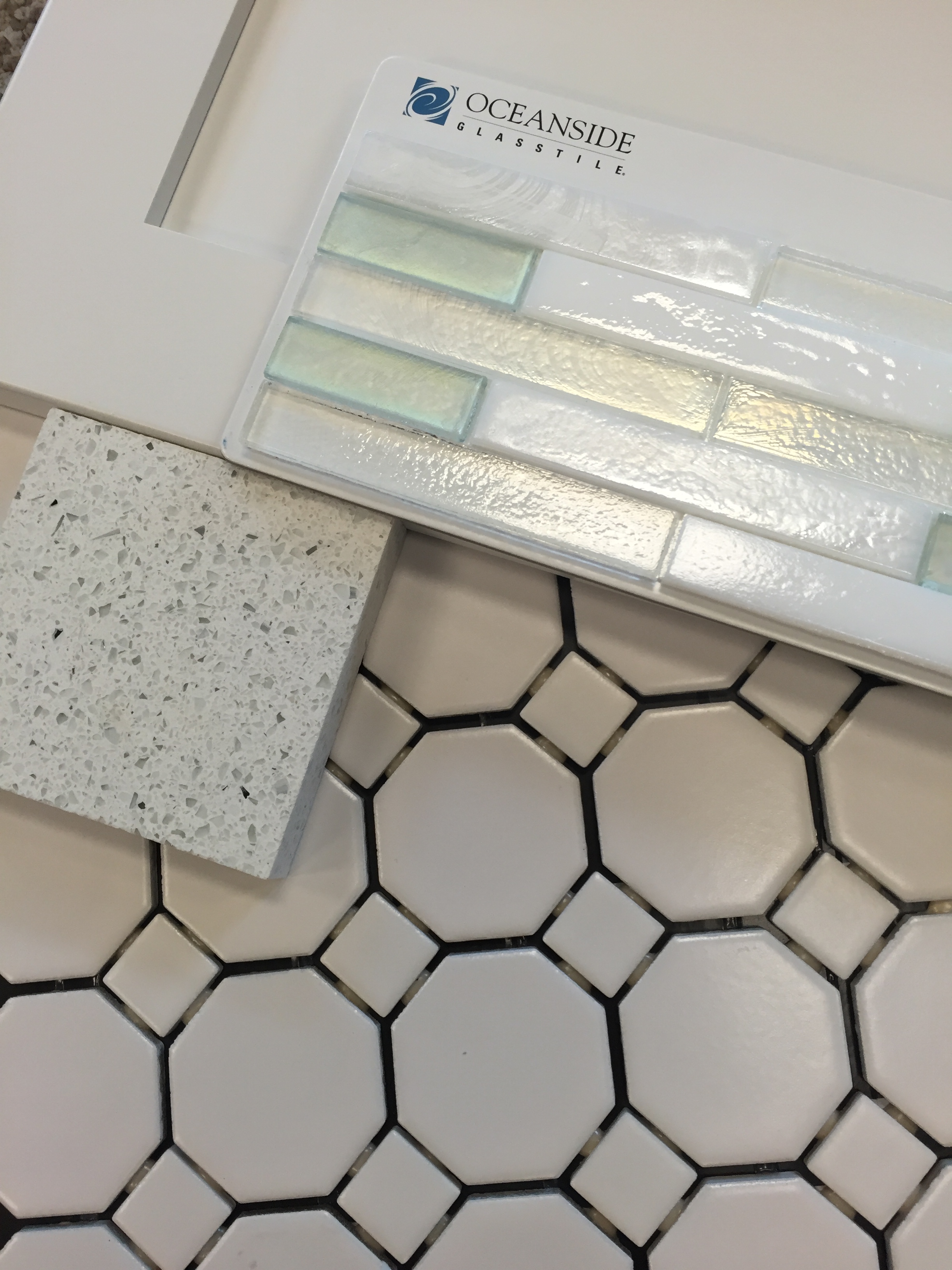 Laundry Room: the laundry room cabinetry will be the same white as the rest of the house, and we are still using the glass flecked slab that my mom and I found at MSI a few months ago. To coordinate with that slab, the tile queen actually picked out an awesome backsplash tile – it’s an Oceanside glass tile. It’s going to look fantastic! Not so fantastic is the octagon file for the floor…I’m really not a huge fan of it. It’s just a busy pattern for my liking, but it’s within our budget and I realize that it’s only a laundry room. I really would have just liked a hex tile for in there – but surprisingly the hex tile is more expensive. Of course!