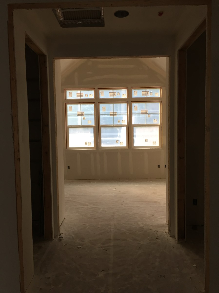 2016-01-24 15.43.13 Published January 24, 2016 at 2448 × 3264 in Week 33: Drywall Taping, Tile Selections & Paint Colors « Previous Next » The office is looking great with the walls getting completed. The doorway to the left is the powder bath, and the one on the right is a closet for the office. Straight ahead will be french doors leading into the office.