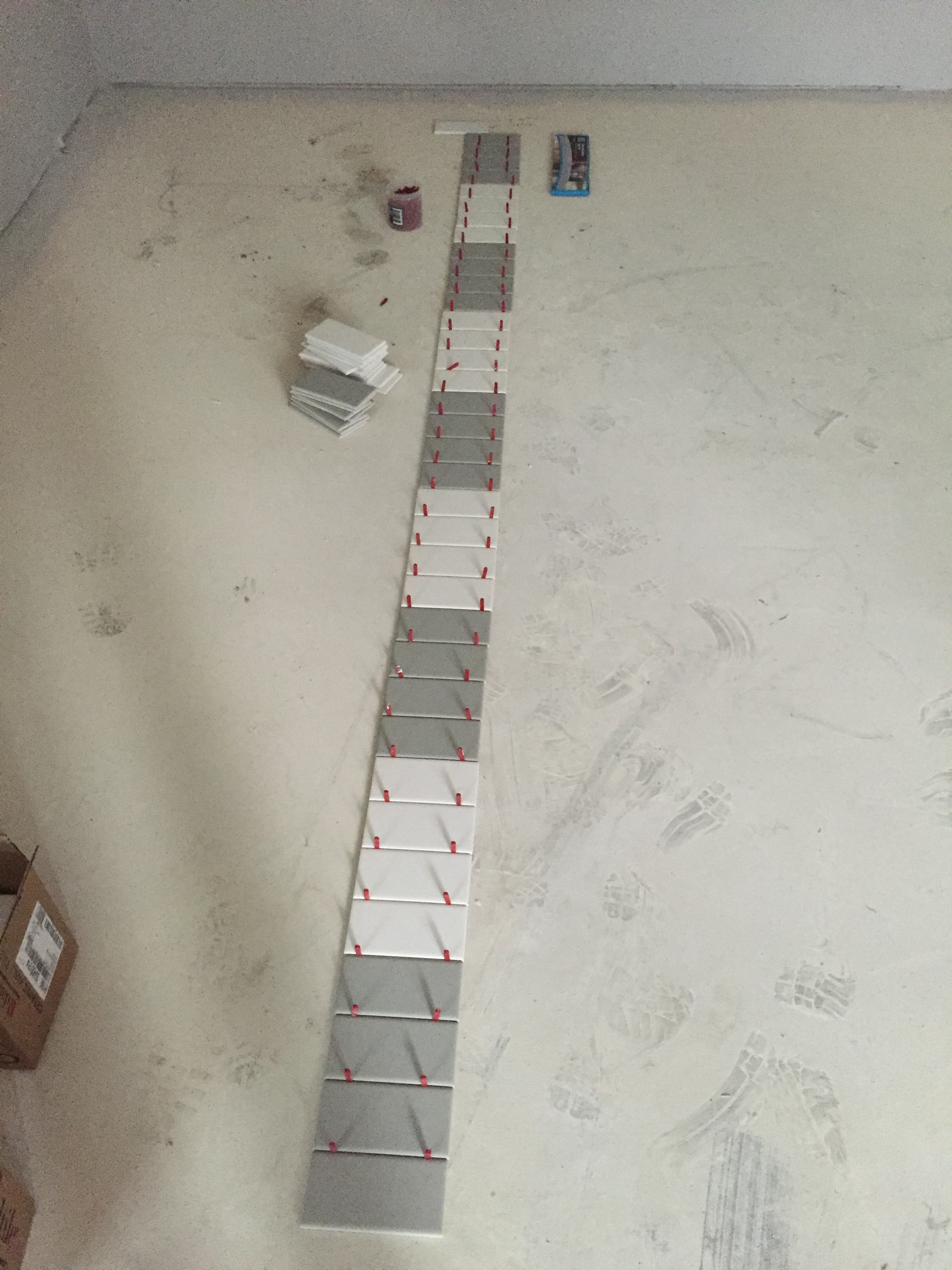2016-02-13 11.46.01 Published February 14, 2016 at 2448 × 3264 in Week 36: Millwork & Tile Prep « Previous Next » The guest bathroom’s shower will have stripes of gray and white all the way around it.