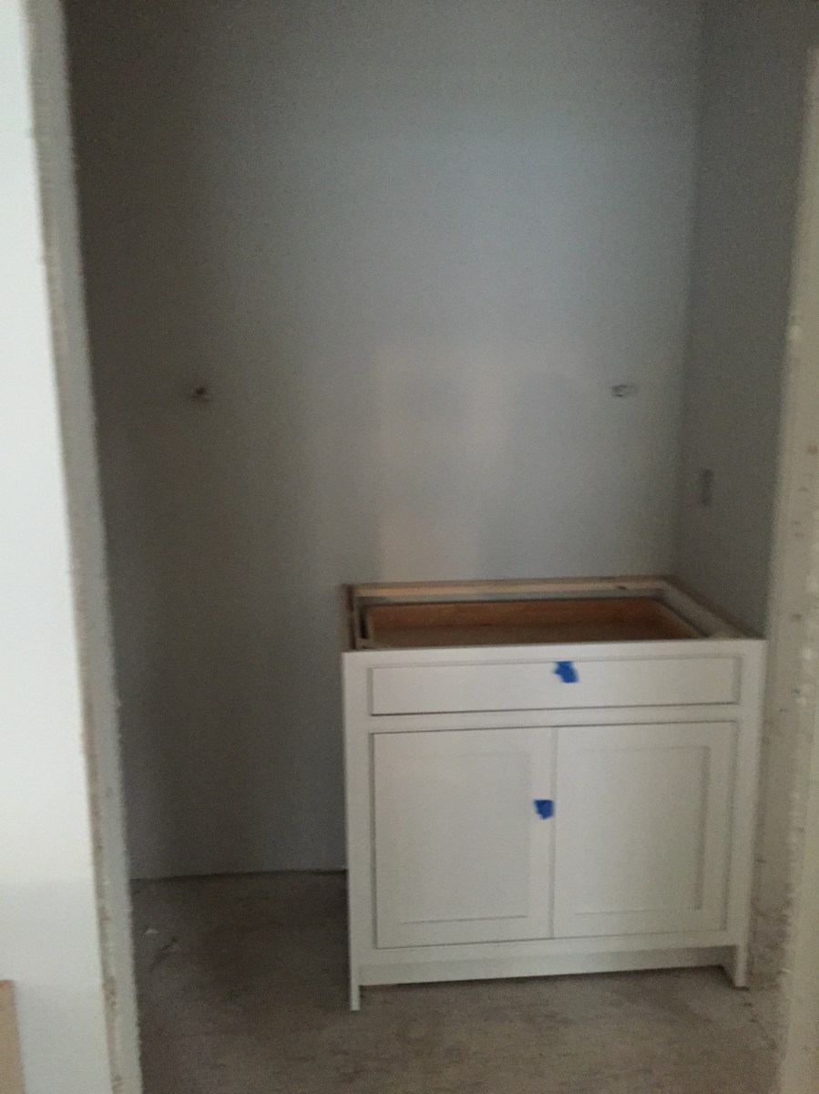 2016-03-04 07.24.59 Published March 5, 2016 at 2448 × 3264 in Week 39: Cabinetry Installed & Tile Progress « Previous Next » One lonely cabinet so far in the butler’s pantry which leads from the kitchen into the dining room. Eventually there will be three upper cabinets and a wine fridge in the space to the left.