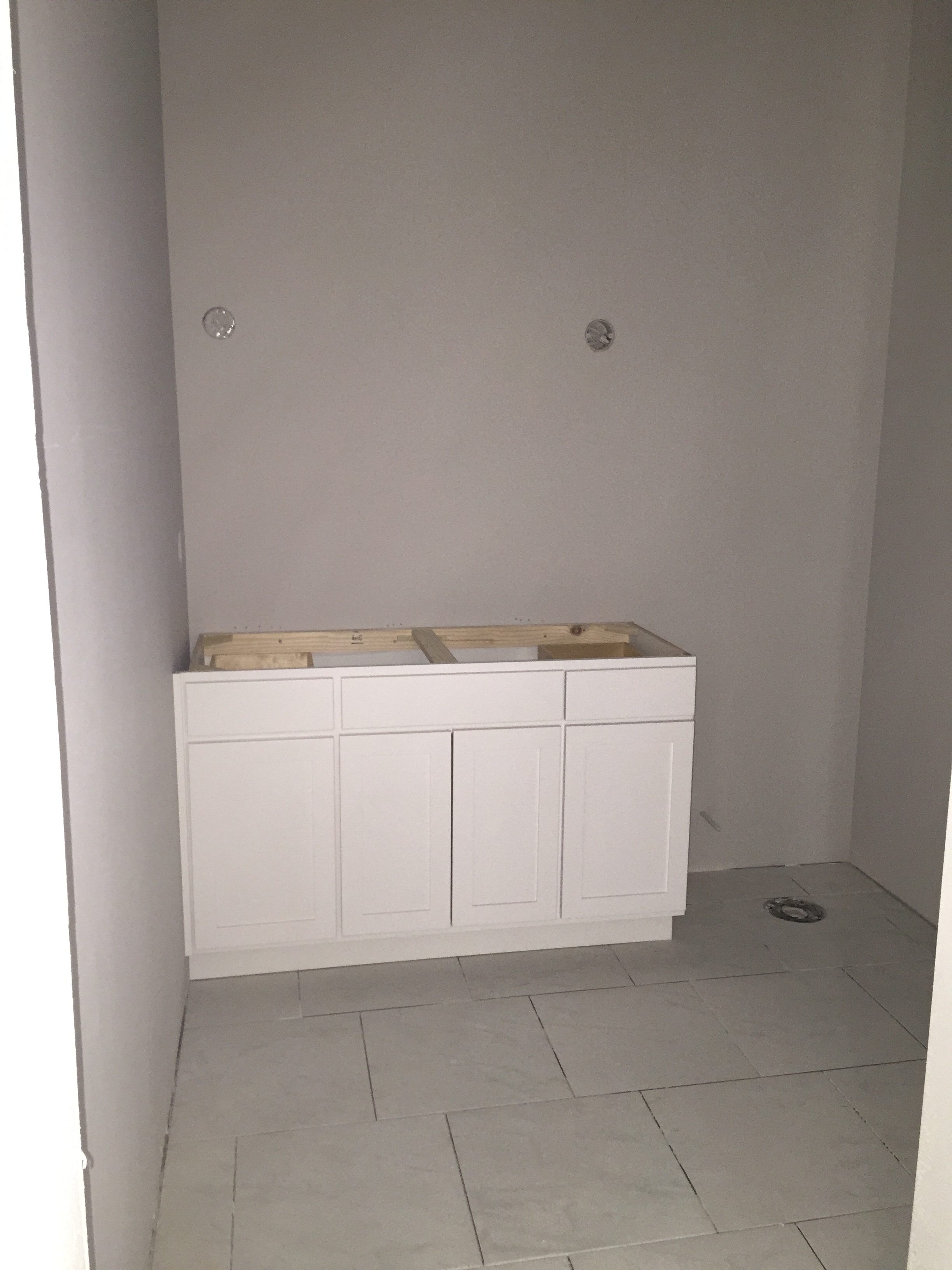 2016-03-05 11.52.45 Published March 5, 2016 at 2448 × 3264 in Week 39: Cabinetry Installed & Tile Progress « Previous Next » The guest bath is pretty easy and simple…nothing fancy here. You can also see the flooring which was installed in a 1/3 offset ‘stepped’ pattern.
