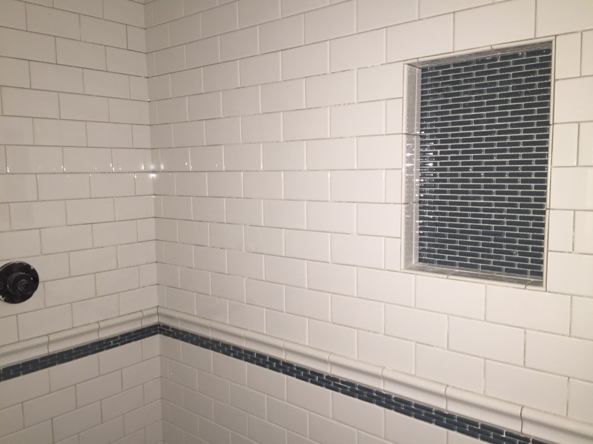2016-03-05 15.51.17 Published March 5, 2016 at 3264 × 2448 in Week 39: Cabinetry Installed & Tile Progress « Previous The nook in the boys bath is finished in the same gray/blue glass tile as the border underneath the chair rail. Just gives it a bit of detail in an otherwise all white bath.