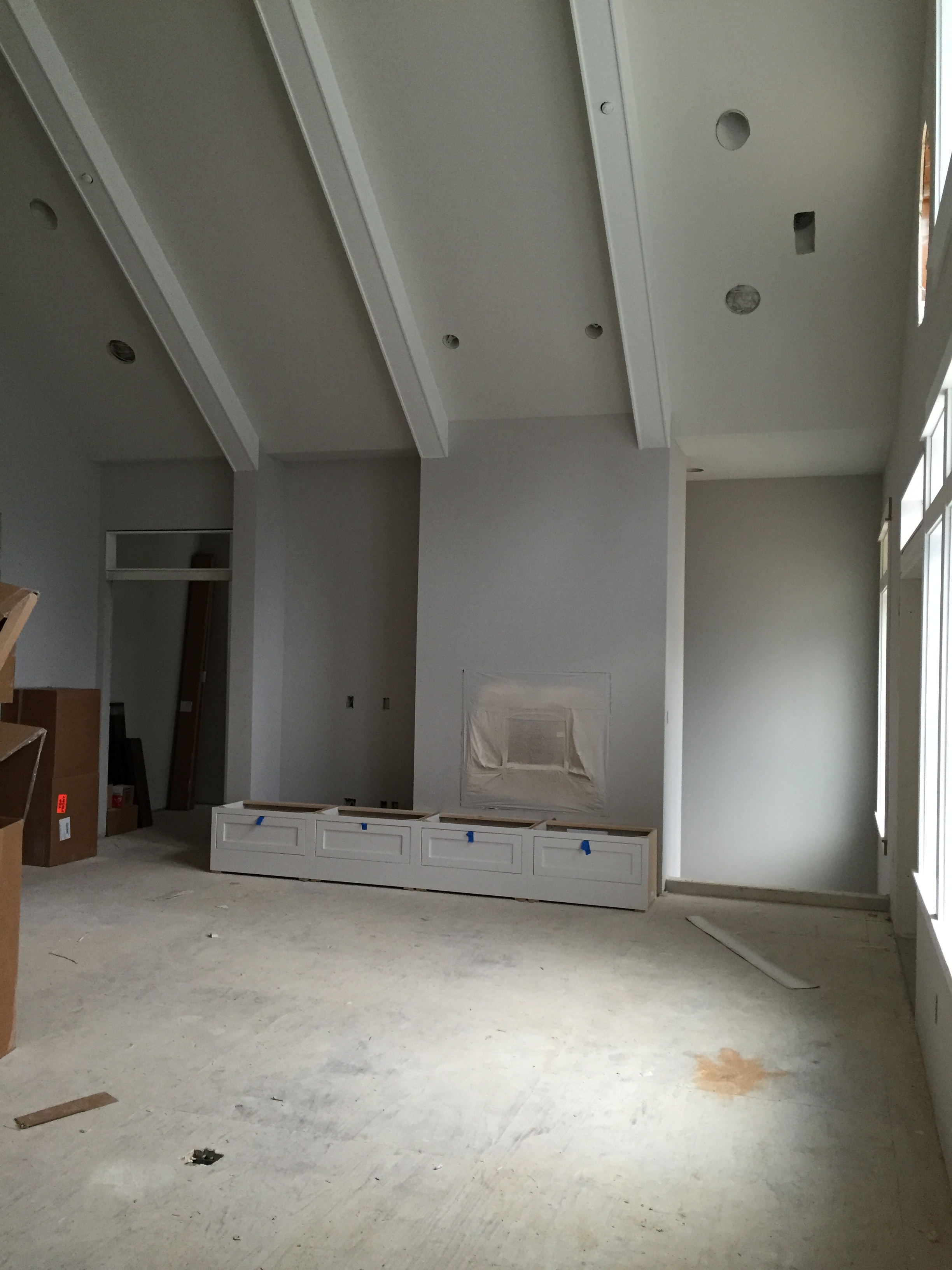 2016-03-05 16.18.52 Published March 5, 2016 at 2448 × 3264 in Week 39: Cabinetry Installed & Tile Progress « Previous Next » The bench area in front of the fireplace has been installed – still waiting on the cabinets that go in the bump-in to the left of the fireplace. The TV will eventually be mounted on the wall in the bump-in area with some shelves above it too.