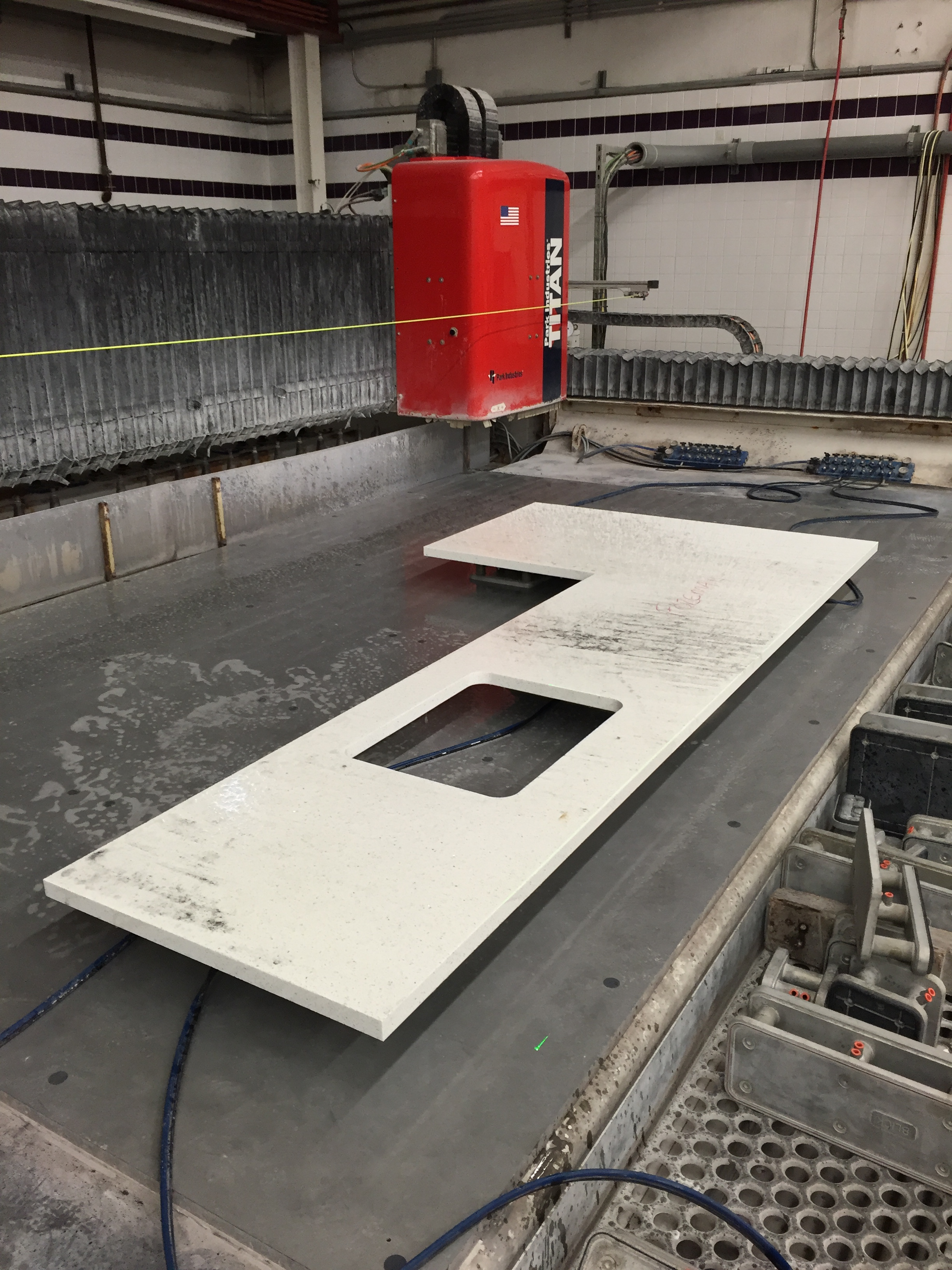 2016-03-08 08.23.32 Published March 13, 2016 at 2448 × 3264 in Week 40: Hardwood, Doors, Cabinetry & Countertops « Previous The laundry room Sparkling White Quartz was on the C&C machine when I was there. It looks white here because this is the underside (and it’s dirty) but really it has green glass flecks in it.