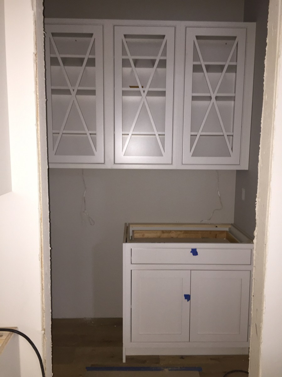 2016-03-13 11.40.15 Published March 13, 2016 at 2448 × 3264 in Week 40: Hardwood, Doors, Cabinetry & Countertops « Previous Next » I love the upper cabinets in the butler’s pantry and my mom already bought the cutest Rose bottles to decorate with in here! It’ll looks even better with the wine fridge!