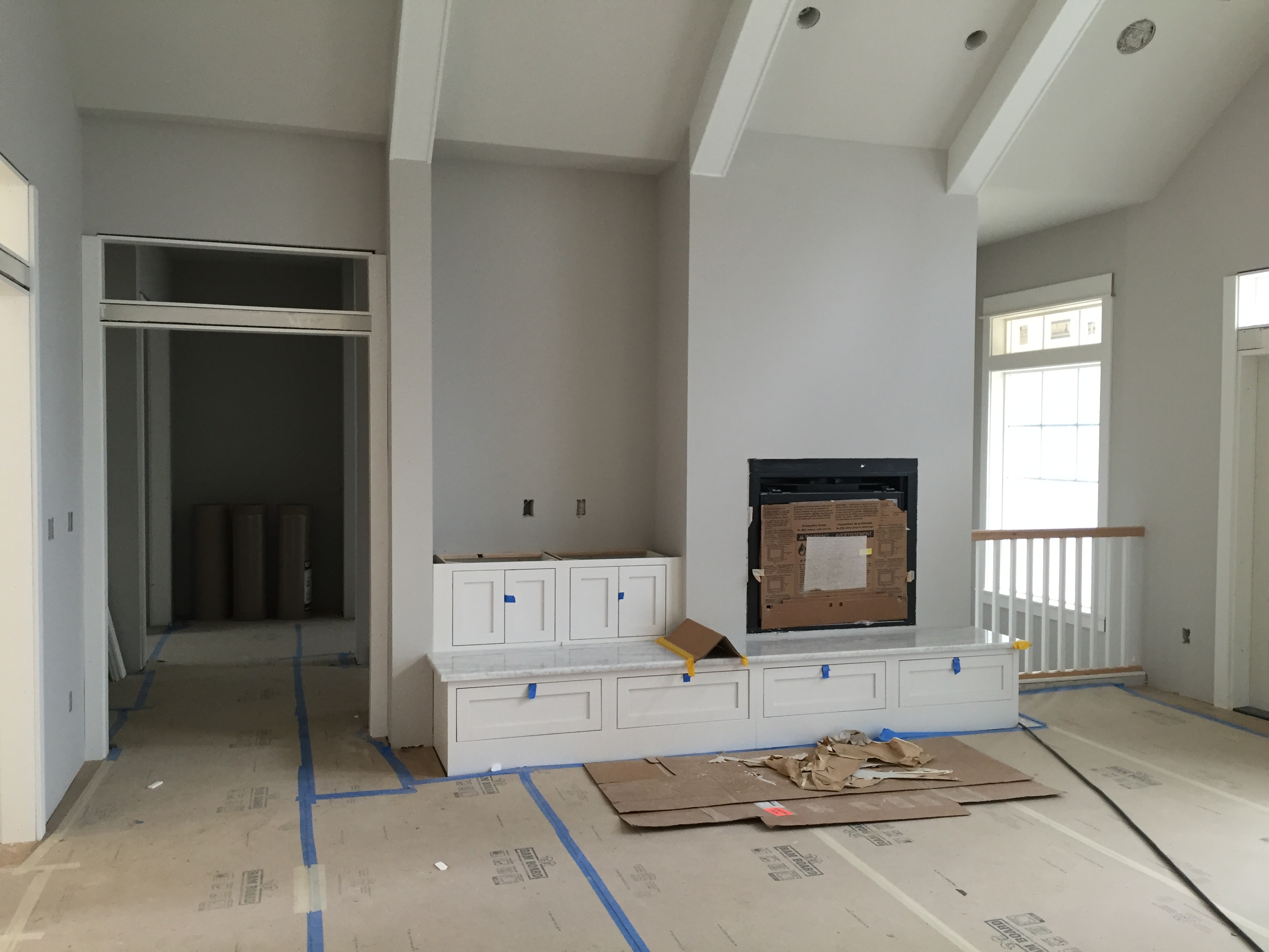 The fireplace is really coming together now. Originally I wanted to use a gray soapstone with white veining for the hearth, but since we had extra of the quartzite we used it…it’s still beautiful and we saved money. Love that! This week Matt and I also discussed the design of the mantle and trimwork up to the ceiling. They also installed the railing in the overlook area to the right of the fireplace.