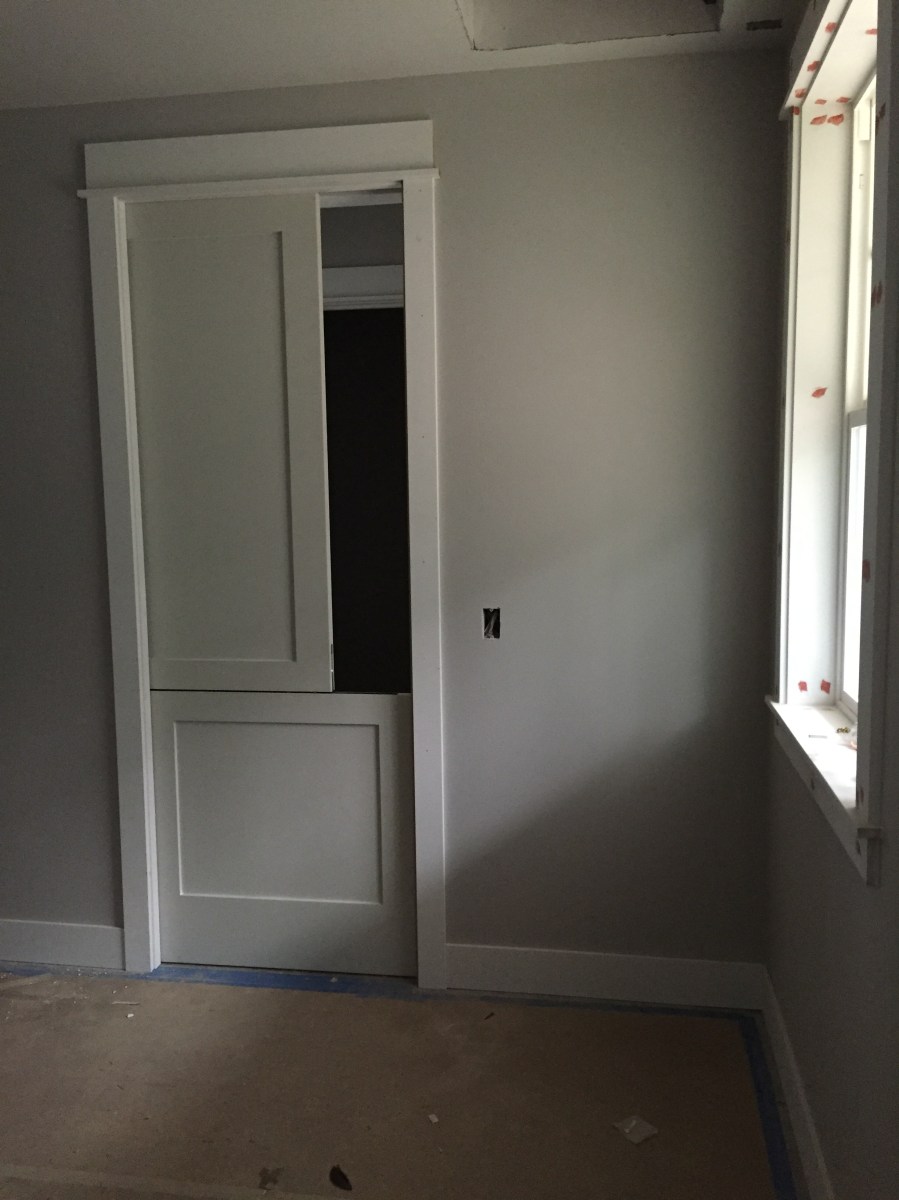 2016-03-23 15.59.10 Published March 27, 2016 at 2448 × 3264 in Week 42: Tile, Trimwork, Stairs, Septic, and Rental House Issues « Previous Next » Matt had never installed a dutch pocket door before, but with a track on the bottom, one in between the two pieces and a track on top – presto we have one!