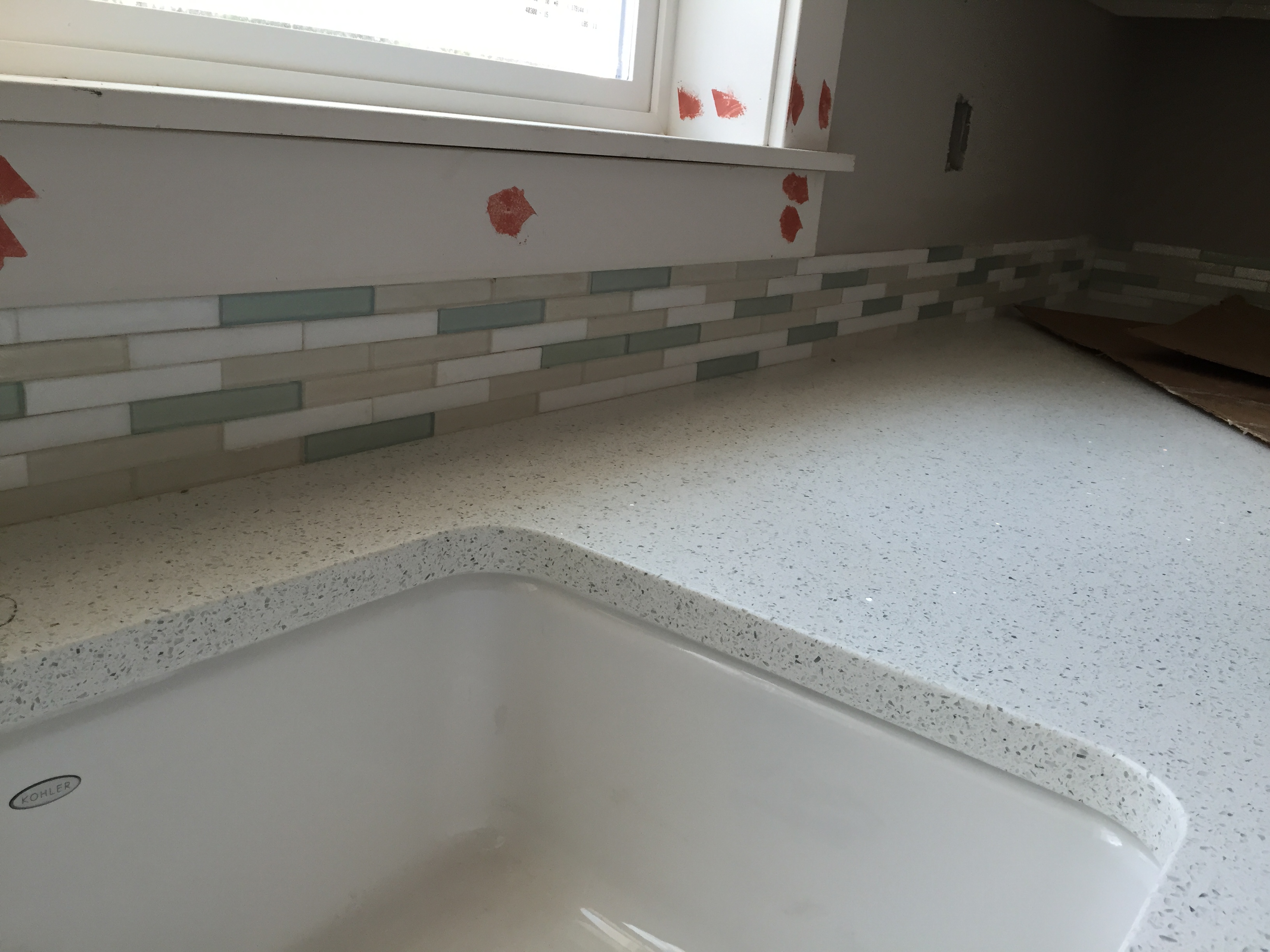 2016-03-26 13.27.43 Published March 27, 2016 at 3264 × 2448 in Week 42: Tile, Trimwork, Stairs, Septic, and Rental House Issues « Previous The glass backsplash was also added in the laundry room. Six rows of the Oceanside glass mosaic tile fit perfectly between the window sill and the counter.
