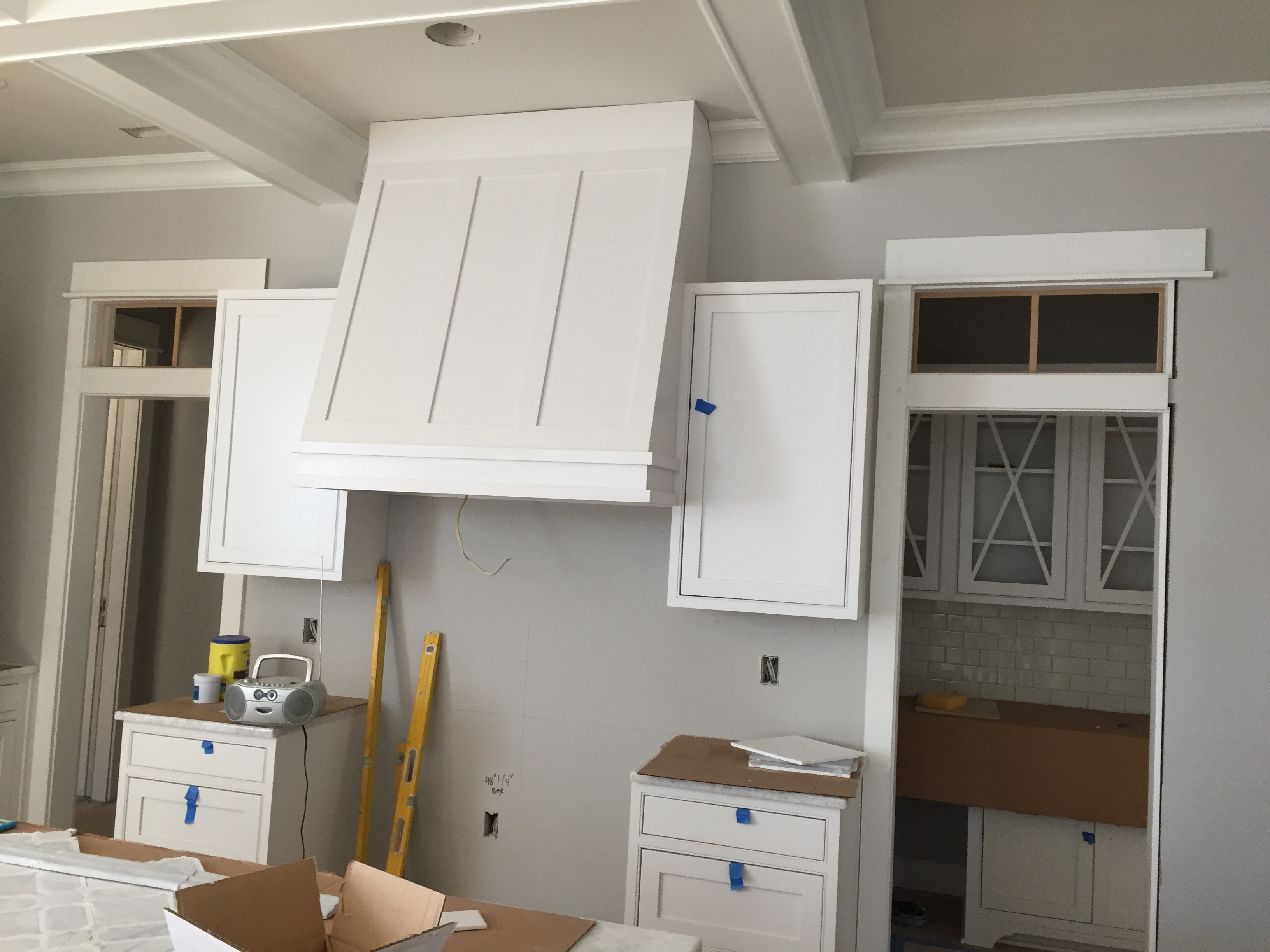 2016-03-26 13.29.31 Published March 27, 2016 at 3264 × 2448 in Week 42: Tile, Trimwork, Stairs, Septic, and Rental House Issues « Previous Next » The crown moulding has been adjusted to end at each side of the hood instead of wrapping around it.