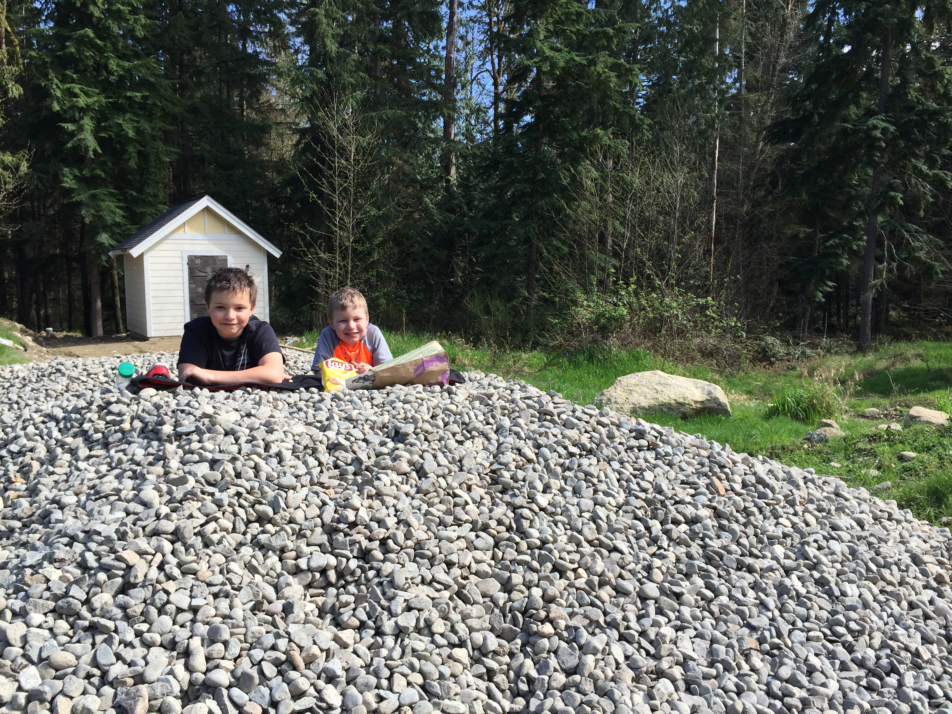 2016-03-26 13.46.05 Published March 27, 2016 at 3264 × 2448 in Week 42: Tile, Trimwork, Stairs, Septic, and Rental House Issues « Previous Next » Here’s the boys basking in the sun while eating their sandwiches on top of the rock pile.