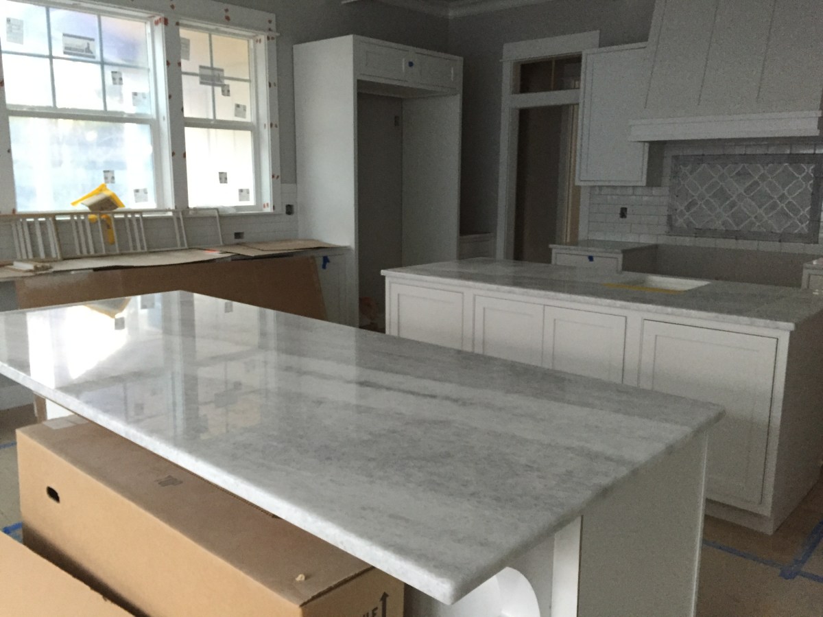 2016-03-29 18.35.58 Published April 8, 2016 at 3264 × 2448 in Week 43: Tile, Slabs, Drainfield & Downstairs Painting « Previous Next » The kitchen island slabs were installed this week – absolute white quartzite.