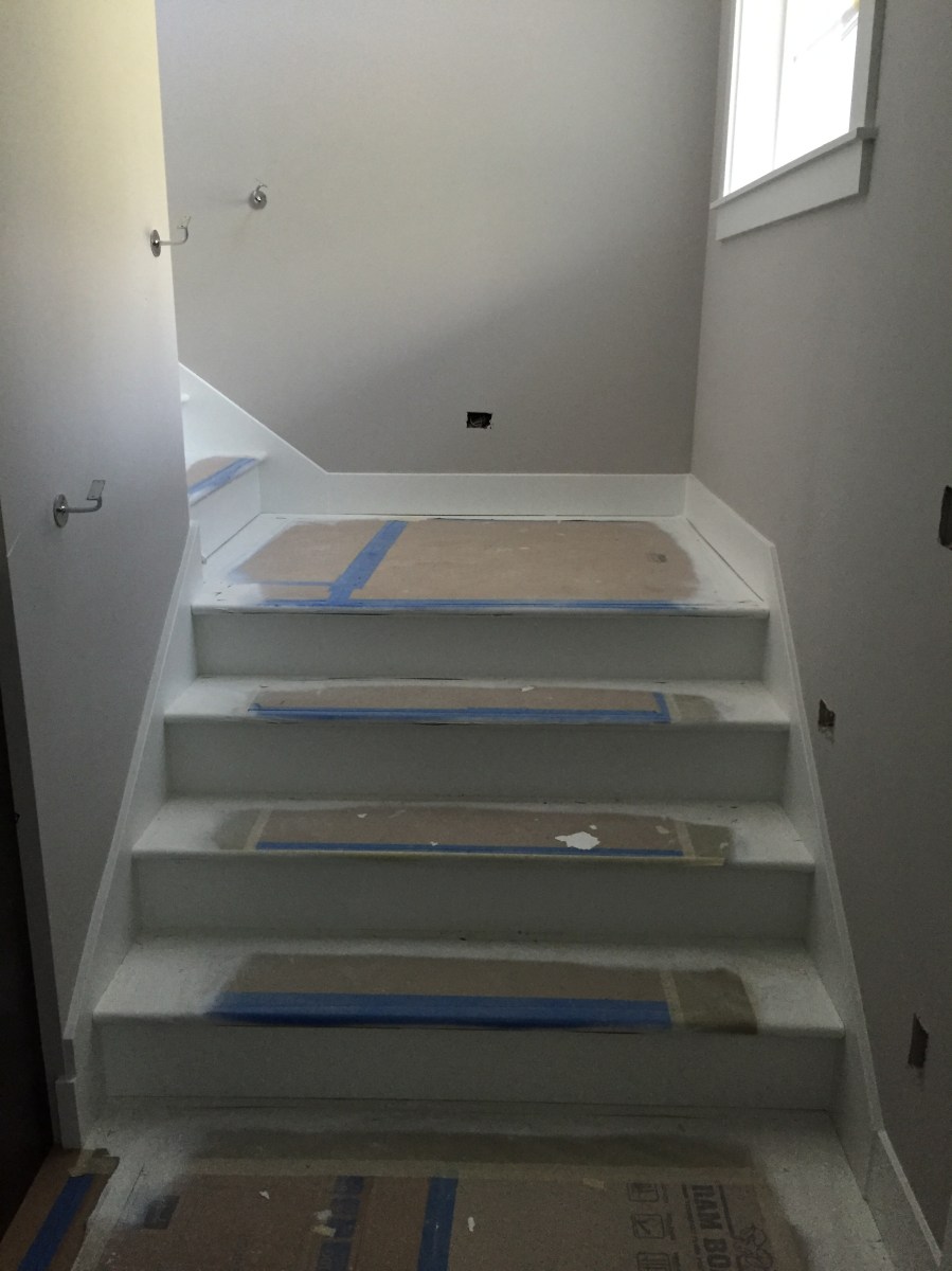 2016-04-08 17.29.57 Published April 23, 2016 at 2448 × 3264 in Week 44: Painting & Bar Top « Previous Next » The stair risers were also painted white this week. We opted for white risers and hardwood stairs.