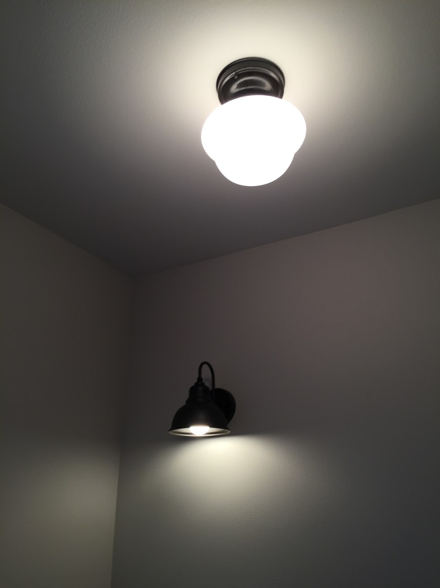 2016-04-20 19.28.18 Published May 13, 2016 at 2448 × 3264 in Week 46: Transoms, Plumbing, HVAC, Lighting & Exterior Painting « Previous The ceiling fixture was from Joel’s elementary school and fits perfectly in the mudroom bathroom.