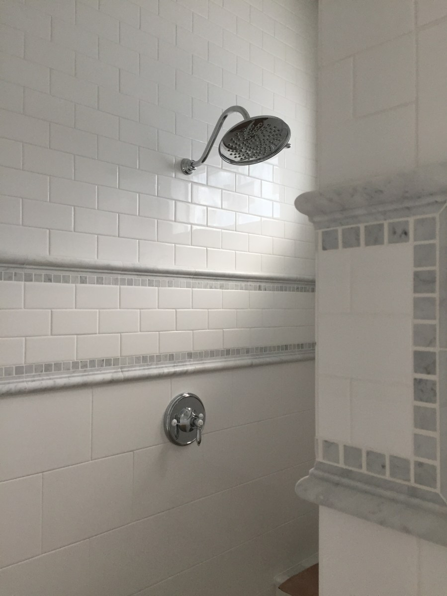 2016-04-24 12.14.37 Published May 13, 2016 at 2448 × 3264 in Week 46: Transoms, Plumbing, HVAC, Lighting & Exterior Painting « Previous Next » Here is one of the shower heads in the master – the rain shower. We set it extra high so that Joel would easily fit underneath it.