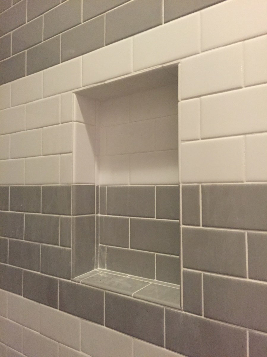 2016-04-28 18.57.59 Published May 13, 2016 at 2448 × 3264 in Week 47: Moving, Appliances, Lighting, Tile & Grading « Previous Next » The shower niche was fixed in the guest shower this week too – originally it had a gray outline and now it’s half white and half gray. It’s all in the details 😉